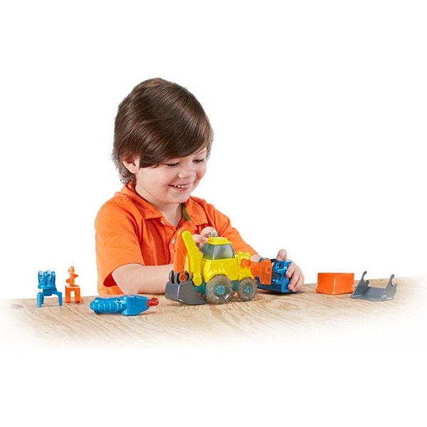Koparka stanie się ulubioną zabawką małego miłośnika Boba i jego przyjaciół. Teraz maluch może sam modyfikować swój pojazd! Użyj spawarki by dołączyć do koparki wybrane elementy. Przyłożenie jej do odpowiedniego miejsca uruchomi realistyczny dźwięki oraz wypowiedzi - maluch będzie zachwycony! Pojazd posiada aż 13 miejsc "spawania" i 6 akcesoriów do wymiany.