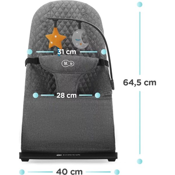 MIMI Kinderkraft to minimalistyczny leżaczek, który zapewni Twojemu dziecku wygodę i relaks w odpowiednim otoczeniu. Dzięki braku nadmiernych bodźców, maluch ma szansę na szybsze uspokojenie się. Oparcie leżaczka można regulować na 3 poziomach, co pozwala dostosować go do potrzeb dziecka. Wygodne siedzisko z przyjemnej w dotyku tkaniny równomiernie rozkłada ciężar dziecka, wspierając jego naturalną postawę podczas odpoczynku. MIMI ma pasy i jest bardzo stabilny, co zapewnia bezpieczeństwo Twojemu dziecku. Dzięki odpinanemu pałąkowi z 2 zabawkami, maluch może miło spędzać czas relaksu. Z MIMI Kinderkraft Twój maluch będzie miał szansę na spokojny sen i relaks.