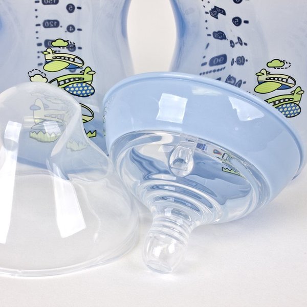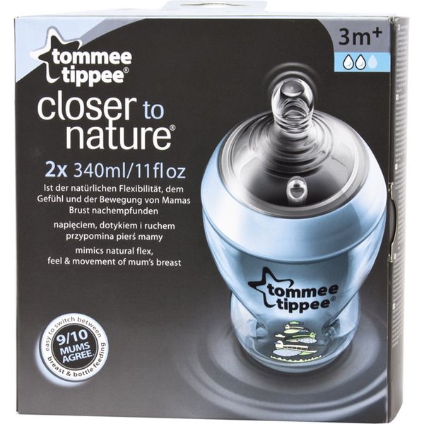 - 2x butelka Closer to Nature® o pojemności 340 ml, dekorowana w kolorze niebieskim, z technologią antykolkową easiventTM, niezawierająca bisfenolu A (BPA)