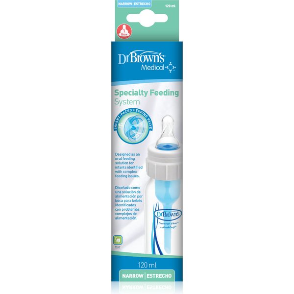 Butelka od Dr Brown, która zaprojektowana została przez lekarzy i wspomaga karmienie w przypadku problemów z tą czynnością. Przyda się ona gdy maluch zmaga się z takimi schorzeniami jak m.in.: rozszczep wargi czy podniebienia, dysfunkcje oro-euromotoryczne, wrodzona wada serca czy inne tego typu dolegliwości. Najważniejszym elementem systemu jest specjalny zaworek, który ma za zadanie sprawić, aby maluch samodzielnie pobierał pokarm z butelki i przy okazji kontrolował jego wypływ. Natomiast gdy nie będzie nam potrzebny możemy bez problemu go wyjąć. Butelka posiada również system odpowietrzania, który pozwala zminimalizować ryzyko wystąpienia kolki. Smoczek wykonany został z miękkiego silikonu, który jest bezpieczny dla dziąsełek.