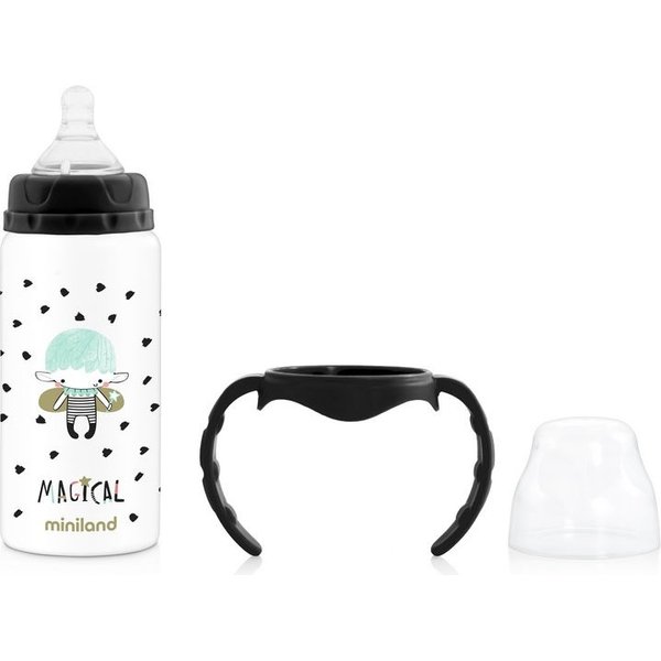 Butelka termiczna od Miniland posiada podwójną ściankę ze stali nierdzewnej, która utrzymuje odpowiednią temperaturę napoju przez dłuższy czas (ok. 6 godzin). Zaprojektowana została dla dzieci do 2 roku życia. Górę butelki można wymienić z bidonem termicznym i na odwrót, więc możemy dobrać opcję, która najlepiej nam dopasuje. Uroczy wygląd i przyjemny w dotyku materiał z pewnością zachęci maluszka do nauki samodzielnego picia. Wyposażona została w dwa uchwyty, które ułatwią dziecku pewne utrzymanie jej w małych rączkach. Gdy jednak nie będziemy ich potrzebować, bez problemu możemy je zdjąć. Smoczek niekapek zapobiegnie wylewaniu się napoju. Praktyczna miarka pozwoli kontrolować odpowiednią ilość płynów.