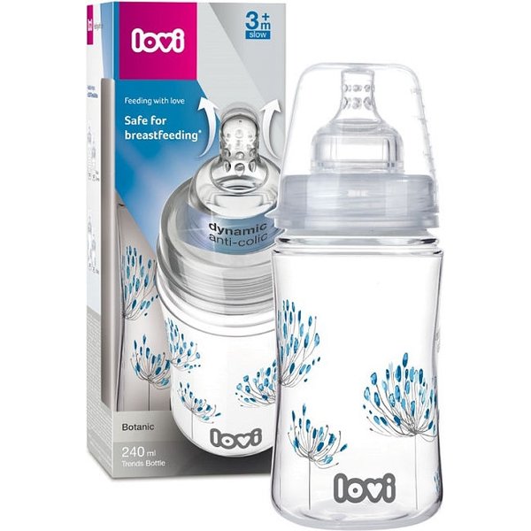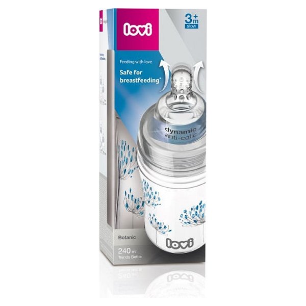 Butelka do karmienia marki Lovi została ozdobiona pięknymi nowoczesnymi wzorami, które czynią ją wyjątkową i jedyną w sowim rodzaju. Wyposażona została w dynamiczny smoczek, który zapewnia bezpieczne karmienie malucha. Specjalny system antykolkowy zmniejsza ryzyko wystąpienia bolesnej kolki u dziecka. Butelka została przebadana medycznie.