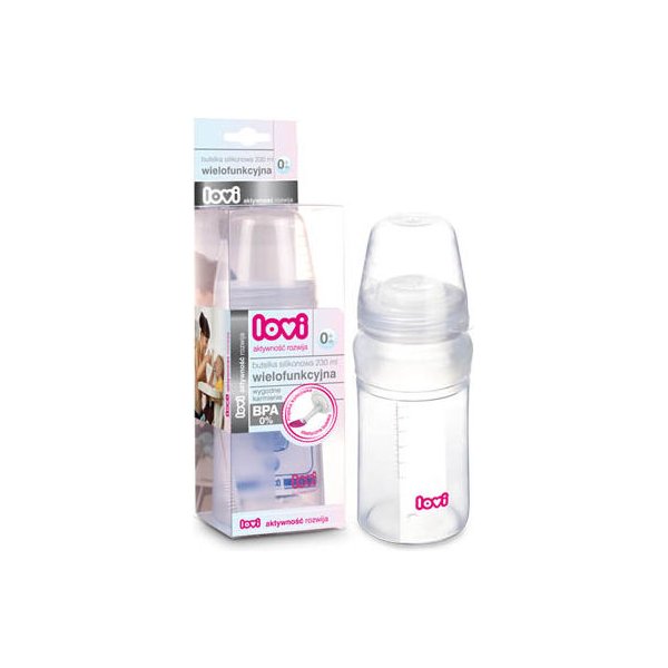 Butelka wielofunkcyjna marki Lovi to wygodne karmienie w domu i na spacerze. Idealne rozwiązanie do podawania pierwszych kaszek, musów i zupek. Wykonana jest z miękkiego silikonu. Wystarczy nacisnąć butelkę, a odpowiednia porcja pokarmu wypływa wprost na łyżeczkę, nie brudząc jej od spodu. Butelka posiada kubeczek z miarką do pojenia niemowląt, szczoteczkę do czyszczenia łyżeczki i dysk, który przekształca ją w pojemnik do przechowywania pokarmu. Do podawania bardziej gęstych pokarmów wystarczy dokupić łyżeczkę z większym przepływem.