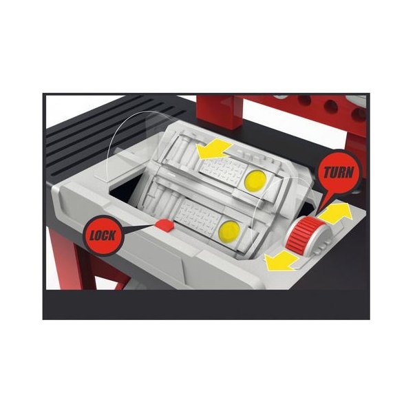 Warsztat posiada wiele półek i wieszaczków, które pomieszczą wszystkie narzędzia i elementy, pomogą zachować porządek po skończonej zabawie.