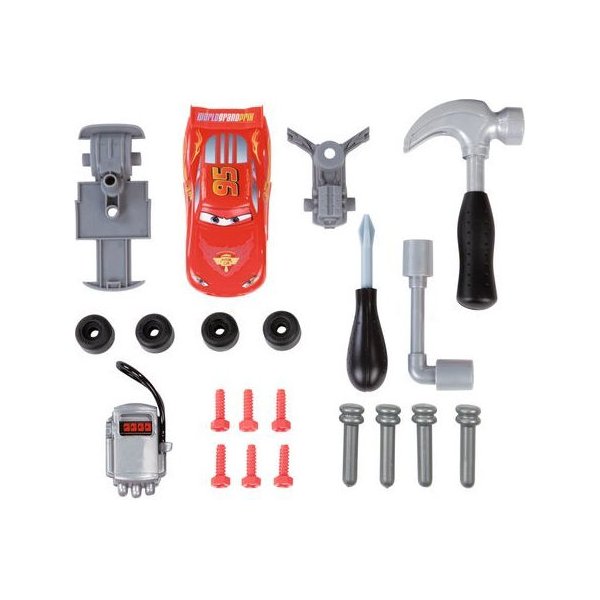 W zestawie znajdziesz wszystkie niezbędne narzędzia. Jest tu klucz, młotek, śrubokręt i wiele więcej, razem 27 akcesoriów! Ale to nie wszystko, teraz możesz również złożyć Zygzaka Mcqueen - ale frajda! Dodatkowo kładka na której będziesz doglądać Zygzaka jest obrotowa.