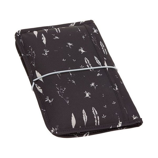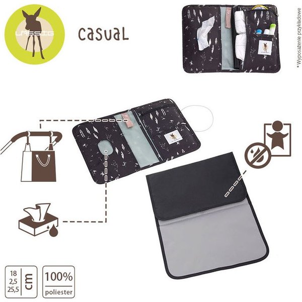 Wewnątrz składanej miękkiej saszetki znajdują się: kieszonka z okienkiem na mokre chusteczki, kieszonka na składaną wodoodporną matę do przewijania, która znajduje się w zestawie, kieszonka na pieluszki na zmianę, mała kieszonka, zapinana na suwak, mała otwarta kieszonka, np. na kremik maluszka oraz zapinana na zatrzask zawieszka na smoczek.