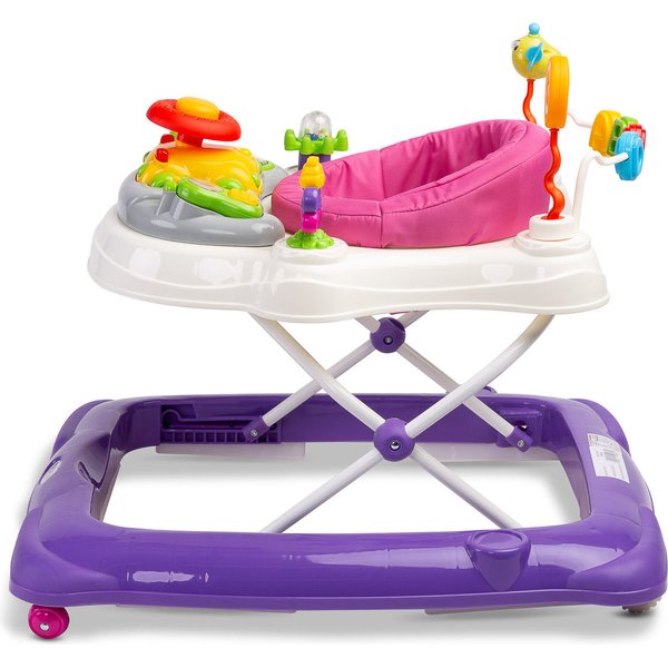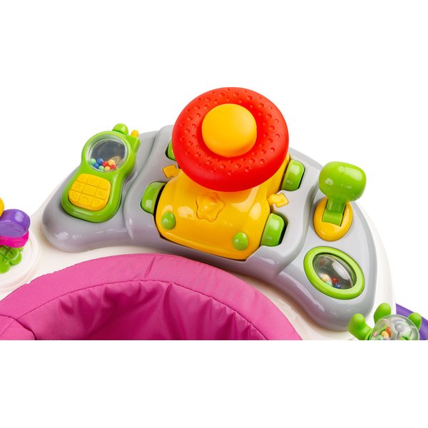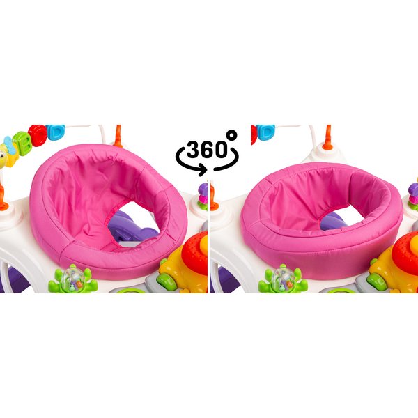Oryginalne wzory i kolory przyciągną uwagę każdego dziecka. Gdy będzie już zmęczony chodzeniem może rozpocząć zabawę! Obrotowe siedzisko 360° pozwala swobodnie bawić się maluszkowi otaczającymi go zabawkami. Znajdzie tu mnóstwo niespodzianek: grzechotki, piszczałki, przyciski aktywujące dźwięki i światełka i wiele ruchomych elementów - zabawa nie będzie miała końca!