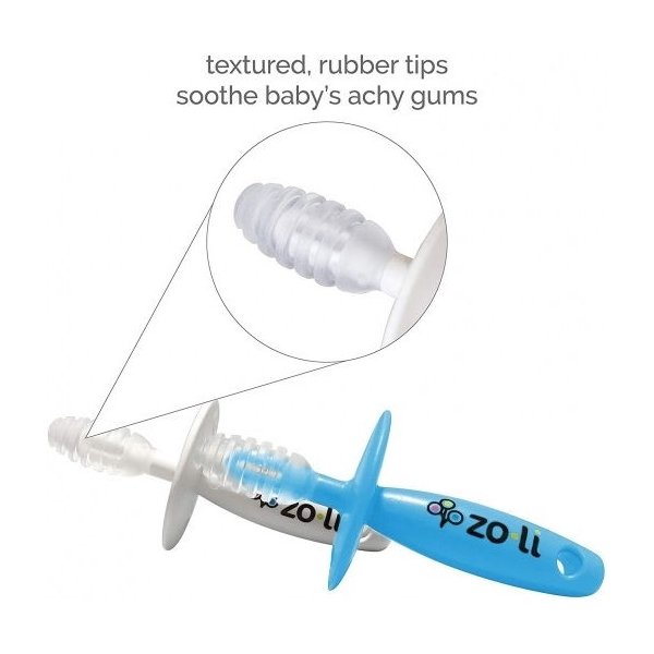 Gryzak marki Zoli przyniesie maluchowi ulgę podczas bolesnego ząbkowania. Miękkie, teksturowane wypustki łagodzą obolałe dziąsła. Zestaw zawiera 2 gryzaki - ich rozmiar jest idealny dla maluch rączek dziecka. Wykonane zostały z bezpiecznego dla dziecka materiału.