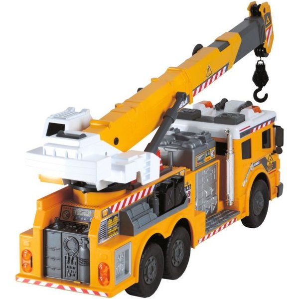 Każdy mały budowlaniec marzy o własnym dźwigu...a taki właśnie jest ten model! Pojazd doskonale odzwierciedla prawdziwy pojazd budowlany, ma około 62 cm długości i utrzymany jest w żółto białej kolorystyce. Wyposażony jest w ruchomy wysięgnik oraz opuszczany hak, a do tego wóz wydaje sygnał świetlny i dźwiękowy - prawdziwa frajda dla malucha! Dźwig posiada kabel i pilot, dzięki czemu jest zdalnie sterowany - zapewnia to długą i emocjonującą zabawę!