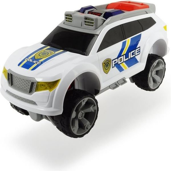 Każdy mały policjant marzy o własnym policyjnym samochodzie pościgowym! Pojazd doskonale odzwierciedla wóz policyjny, wykonany jest w kolorach białym i czarnym, z elementami czerwieni. Wóz ma około 32 cm długości i posiada realistyczne efekty dźwiękowe i świetlne. Po włączeniu przycisku znajdującego się na dachu reflektory samochodu zostaną wysunięte, a sam pojazd przemieni się w samochód terenowy - idealny do jazdy po trudnym terenie i gonienia przestępców. Zabawka posiada cztery ruchome koła.