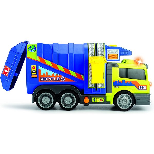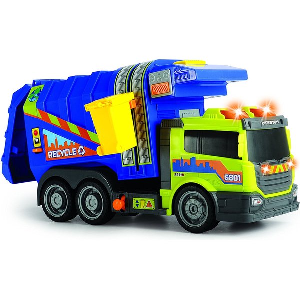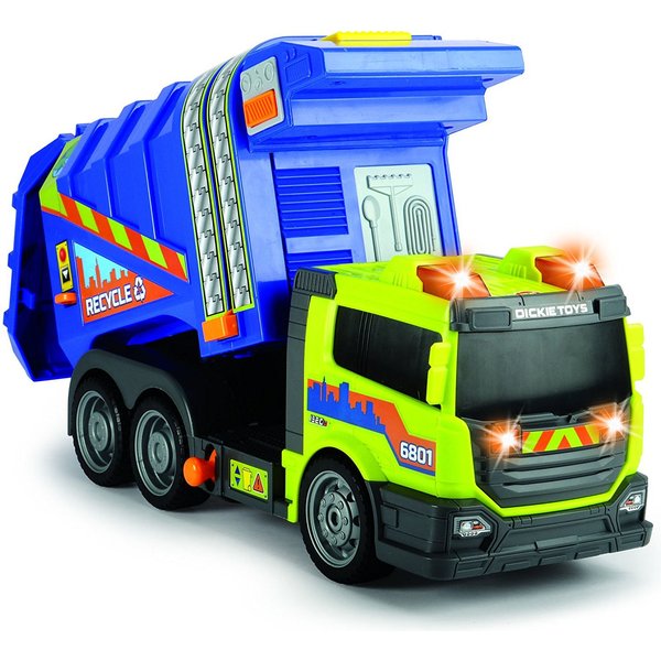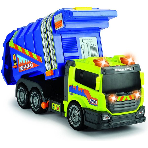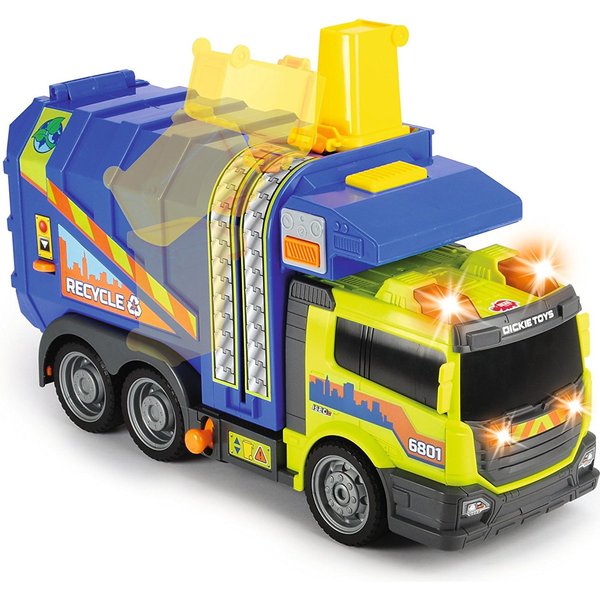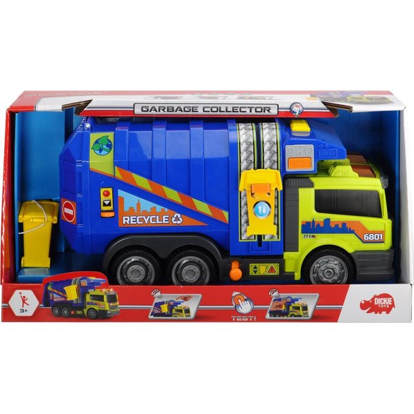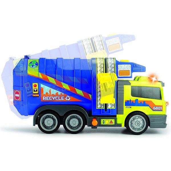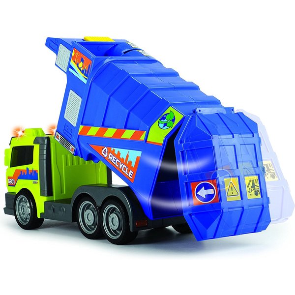 Duża śmieciarka wydająca efekty dźwiękowe oraz świetlne pozwoli Ci na prawdziwe odwzorowanie dnia z życia oczyszczania miasta. Ciężarówka wyposażona jest w kontener na śmieci, ruchomy podnośnik umożliwiający opróżnianie kontenera, możliwość wysypania całkowitej zawartości śmieciarki poprzez przechylenie pojemnika oraz otwieraną tylną klapę, dzięki której można ładować do auta przedmioty.