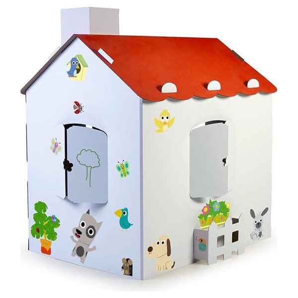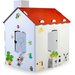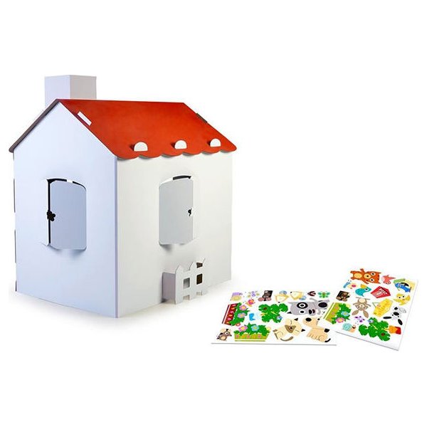 Wykonany z trwałego kartonu domek nie jest jeszcze w pełni gotowy. Rodzice lub starsze rodzeństwo pomogą go poskładać, ale najpierw należy go ozdobić. W komplecie z domkiem znajdziesz kolorowe naklejki o różnorodnej tematyce, które można wykorzystać do tego celu. Jednak nic nie stoi na przeszkodzie, aby dziecko samodzielnie ozdobiło domek własnymi rysunkami. Niech w ruch pójdą farby, mazaki i kredki! Zabawka pozwala dziecku na swobodny rozwój kreatywności, zdolności manualnych i umiejętności współpracy z rodzicami, rodzeństwem lub przyjaciółmi.