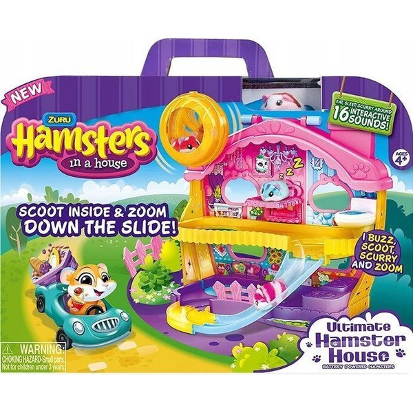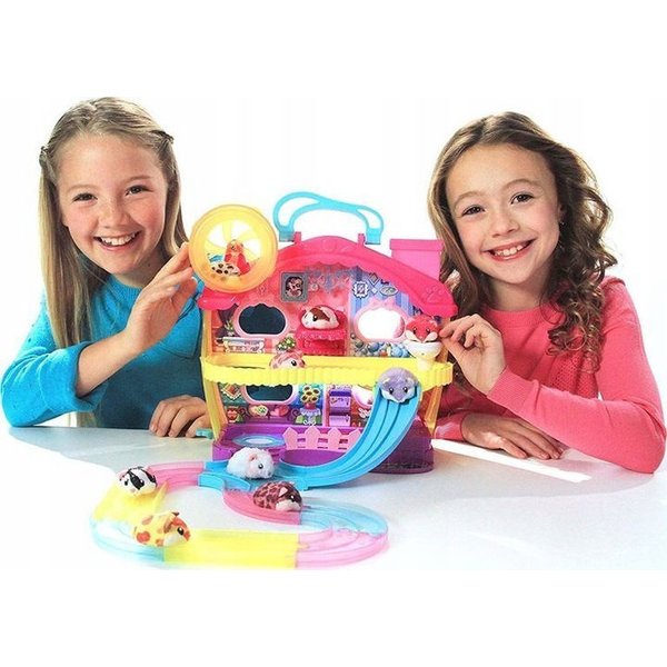 Interaktywny zabawny chomik zaprasza Cię do swojego niezwykłego świata. Pozwiedzaj jego domek i zobacz jakie tajemnice kryje! Chomik porusza się jak prawdziwy. W jego willi znajduje się wszystko co potrzebne: kuchnia, łazienka, sypialnia i salon. Na dachu natomiast znajduje się kołowrotek w którym mały pupilek uwielbia spędzać wolny czas. Do domku dołączona jest zjeżdżalnia, którą możemy połączyć piętra, a która sprawia, że chomik porusza się szybciej. Zestaw posiada 16 efektów dźwiękowych.
