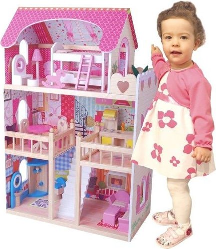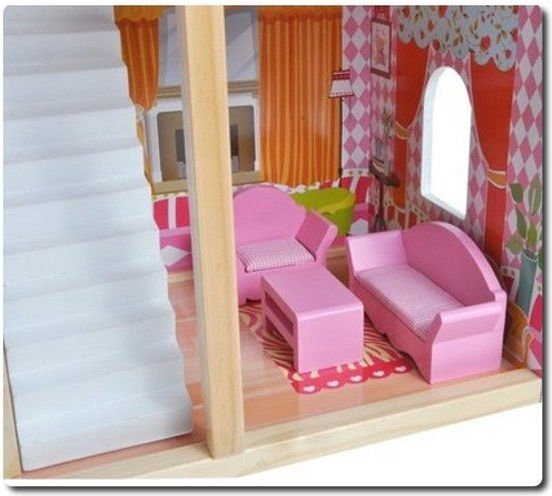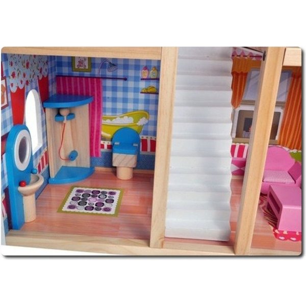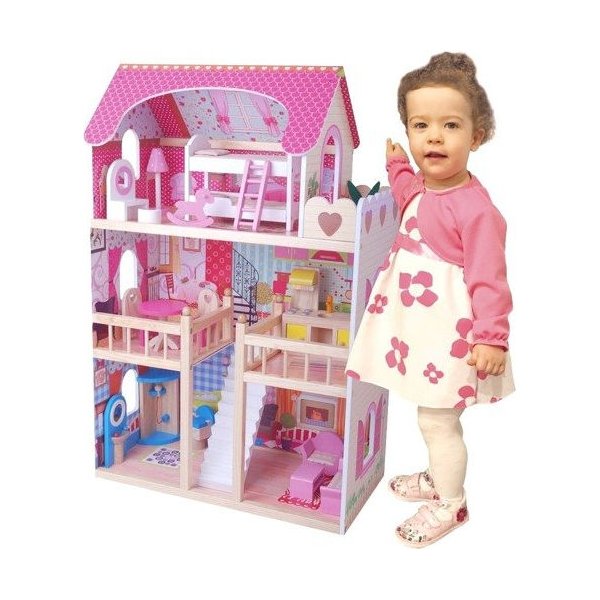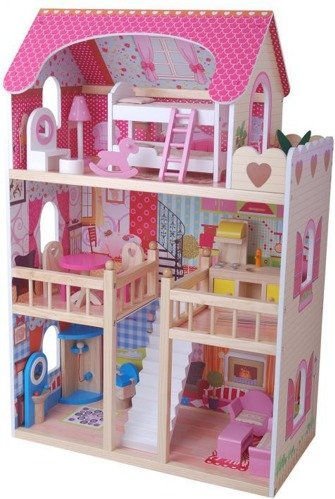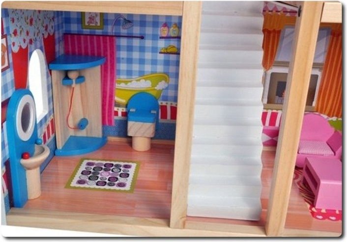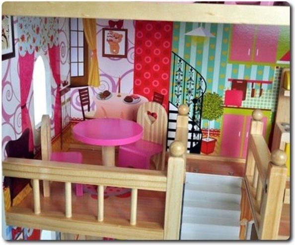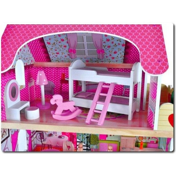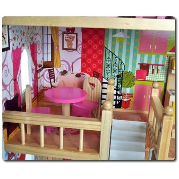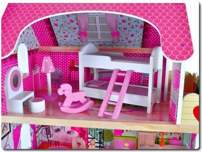 Ten niezwykły domek dla lalek z oświetleniem to spełnienie marzeń każdej dziewczynki. Jest to 3 poziomowa rezydencja, która posiada 5 pomieszczeń i taras. Każde z pomieszczeń zostało wyposażone w mebelki (16 sztuk) i posiada indywidualny wystrój. W domku tym mogą zamieszkać wszystkie lalki o wysokości ok. 10 cm, a umeblować je można według własnego upodobania.