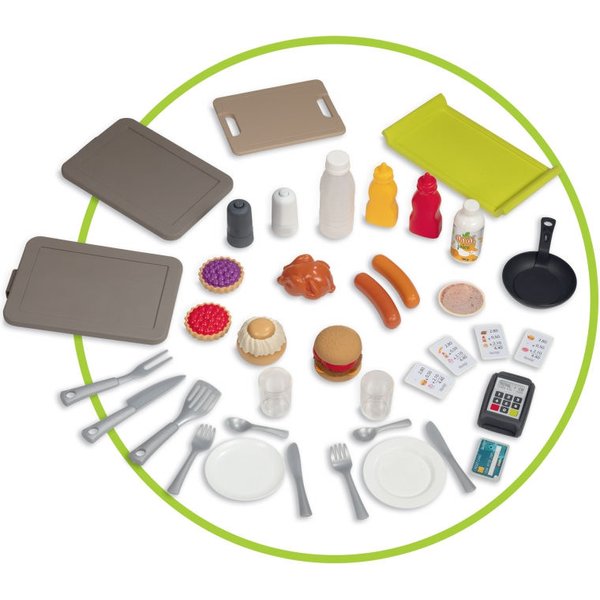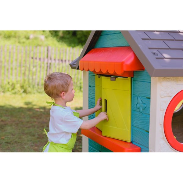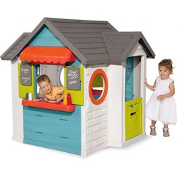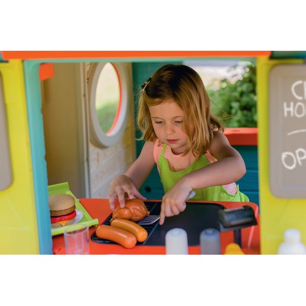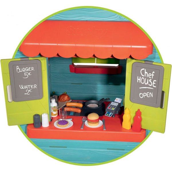 Teraz każdy mały kucharz może mieć poprowadzić swój bar czy restaurację! Smoby zaprojektowała domek dla szefa kuchni, który został wyposażony we wszystkie akcesoria potrzebne do smacznej zabawy. Znajduje się w nim kuchnia ze zlewem i kasa sklepowa z czytnikiem kart płatniczych. Dodatkowo zaopatrzona została w potrzebne artykuły spożywcze i naczynia takie jak talerzyki, sztućce. Otwierane okiennice dają możliwość powieszenia tablicy i spisaniem menu. Całość wykonana została z materiałów wysokiej jakości z powłoką anty UV, która ochroni przed słońcem. To zapewni trwałość produktu.