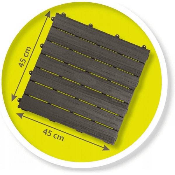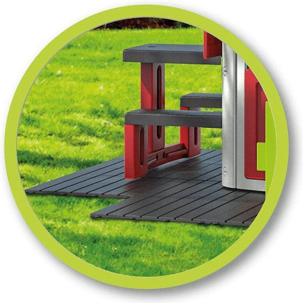 Dodatkowo do zestawu dołączona jest podłoga do domku od Smoby pozwoli stworzyć domową atmosferę w ogródku. Zestaw składa się z 6 płytek, które są antypoślizgowe co pozwoli na bezpieczne użytkowanie jej przez dzieci. Ich montaż jest bardzo prosty co zapewnia szybki system składania. Można z nich stworzyć nie tylko podłogę, ale również taras czy ścieżkę. Dzięki powłoce anty UV będzie nam służyć równie długo jak domek.