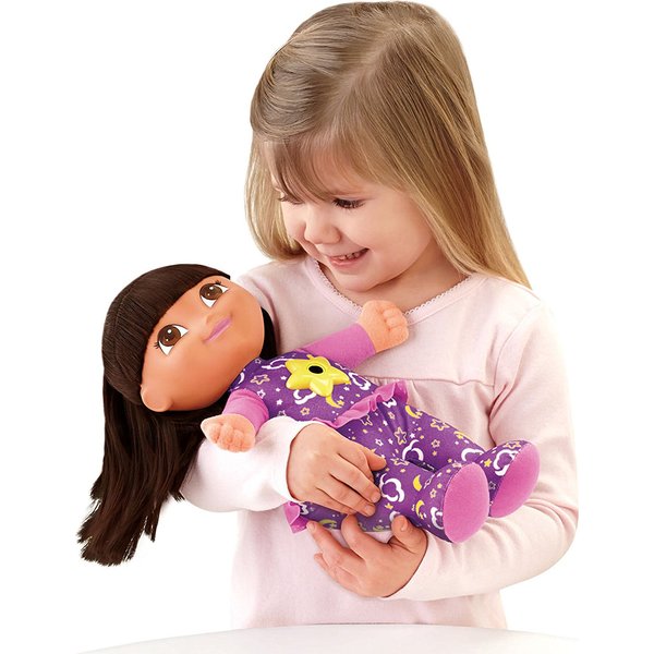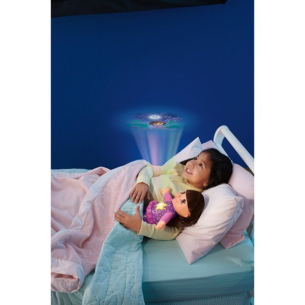 Naciśnięcie na brzuszek Dory sprawi, że laleczka wypowie zdanie i odegra delikatną kołysankę. Dodatkowo gwiazdka na środku pidżamki zacznie świecić, a na suficie pokaże się kolorowy obrazek z Dorą - ale frajda!