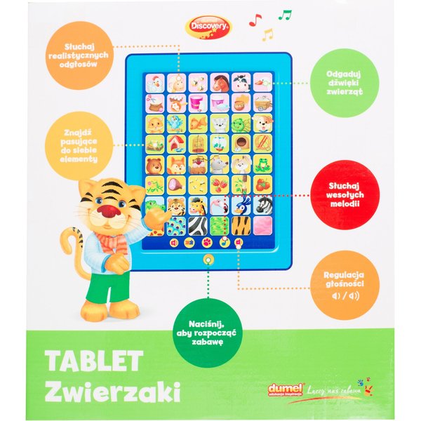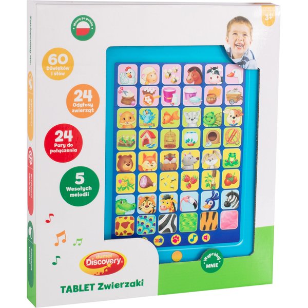 Mówiący tablet od firmy Dumel wprowadzi dziecko w świat zwierząt. Dzięki niemu maluch pozna 24 odgłosy, które wydają poszczególne zwierzęta. Odkryje co jedzą, gdzie mieszkają, co wytwarzają, a nawet jak wyglądają. Zabawa polega na połączeniu obrazków w parę lub dopasowaniu usłyszanego dźwięku do odpowiedniego stworzenia. Tablet posiada również 5 wesołych melodii, które z pewnością umilą czas.