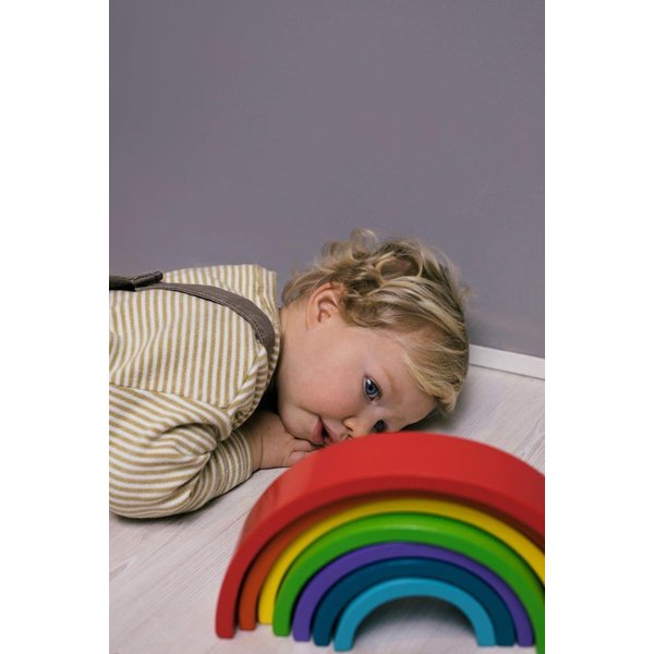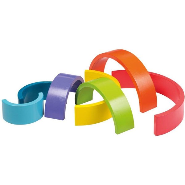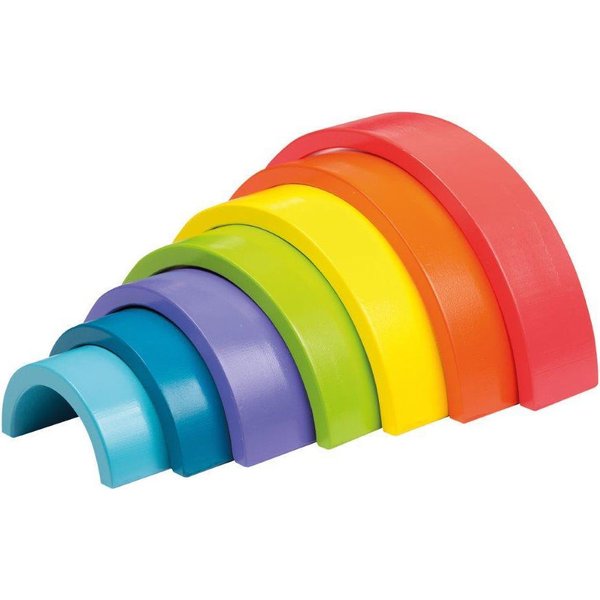Siedem pięknych, kontrastowych kolorów zachęca maluszka do ćwiczenia małej motoryki, umożliwia łatwą i przyjemną naukę kolorów, rozpoznawania różnic: większe - mniejsze i rozwija wyobraźnię przestrzenną. Możliwości zabawy z udziałem tęczy jest nieskończenie wiele: układanka, równoważnia, a może tunel dla samochodzików? Wszystko w zasięgu małych rączek! Zabawka wykonana została z wysokiej jakości certyfikowanego drewna i pomalowana w pełni bezpieczną dla dzieci, nietoksyczną farbą.
