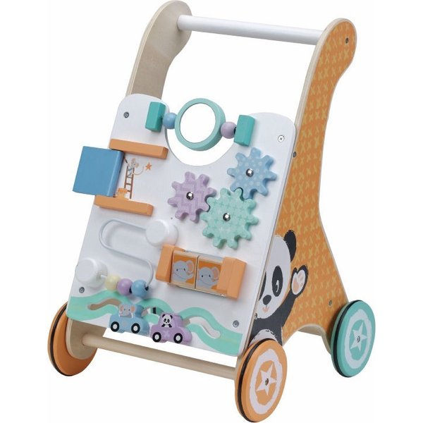 Z tą drewnianą zabawką z serii Studio Circus doskonalenie zdolności motorycznych i ćwiczenie prawidłowego chwytu będzie wspaniałą przygodą. Wykonany z dobrze oszlifowanego drewna pchacz został pomalowany pastelowymi farbami, całkowicie bezpiecznymi dla malucha. Elegancki i jednocześnie kolorowy pchacz z mnóstwem ruchomych elementów na interaktywnym panelu, przyciągających uwagę malucha to gwarancja świetnej zabawy. Zabawka jest wyposażona w gumowe kółka, które nie rysują podłogi. Cała konstrukcja jest bardzo stabilna, a dodatkowym atutem dla malucha jest miejsce na przewożenie małych zabawek.