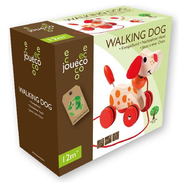 Piesek do ciągnięcia marki Joueco to idealna zabawka, która wspomoże dziecko w nauce chodzenia. Piesek został wykonany bardzo estetycznie, jego szeroko rozstawione koła sprawiają, że zabawka jest stabilna. Piesek posiada sznureczek, za który dziecko może ciągnąć. Potrafi ruszać główka i ogonkiem.