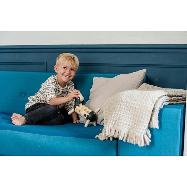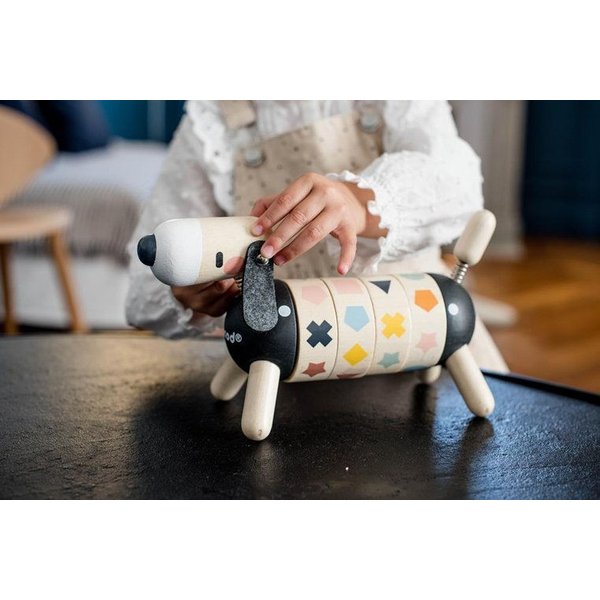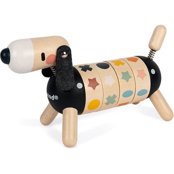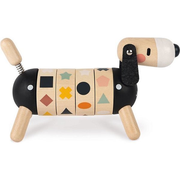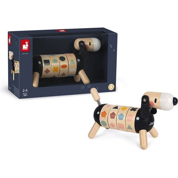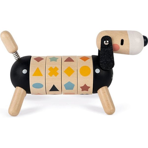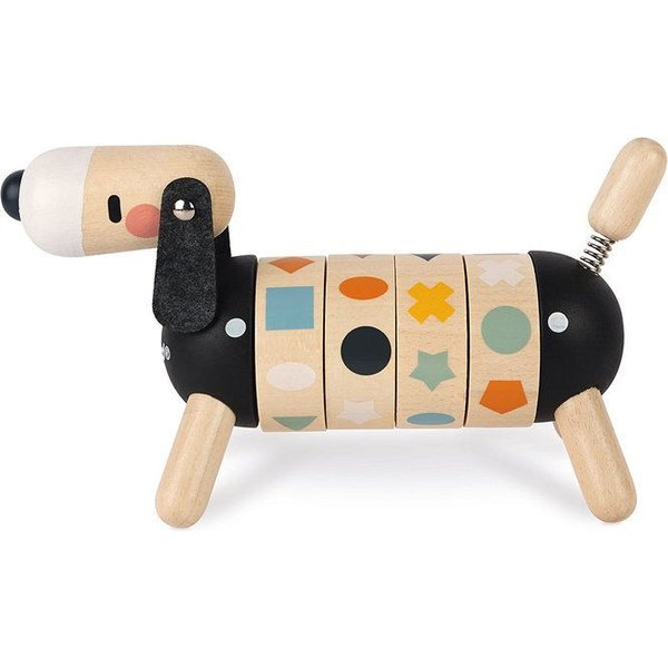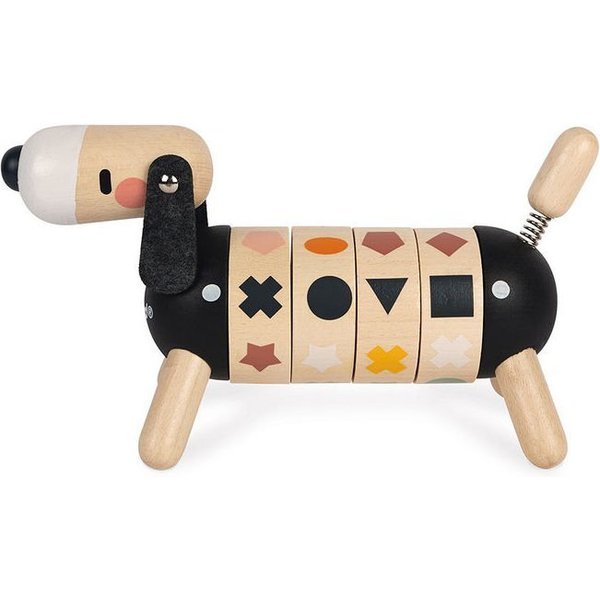 Drewniany sorter kształtów od Janod, który pozwoli maluszkowi rozwijać swoje zdolności manualne oraz spostrzegawczość. Posiada kształt pieska z ogonkiem i główką na sprężynce oraz długimi, czarnymi uszami. Wyposażony został w 4 obręcze z obrazkami, które należy skompletować, czyli ułożyć w jednej linii 4 takie same figury. Został wykonany z drewna i pomalowany bezpiecznymi farbkami.