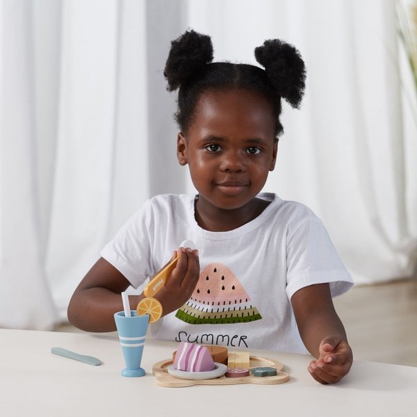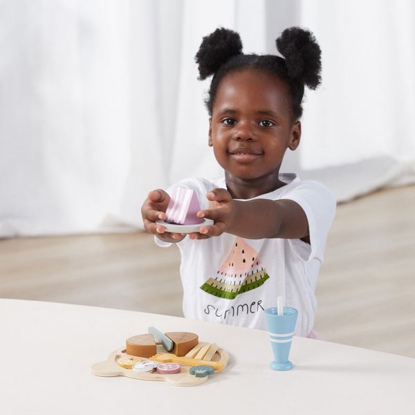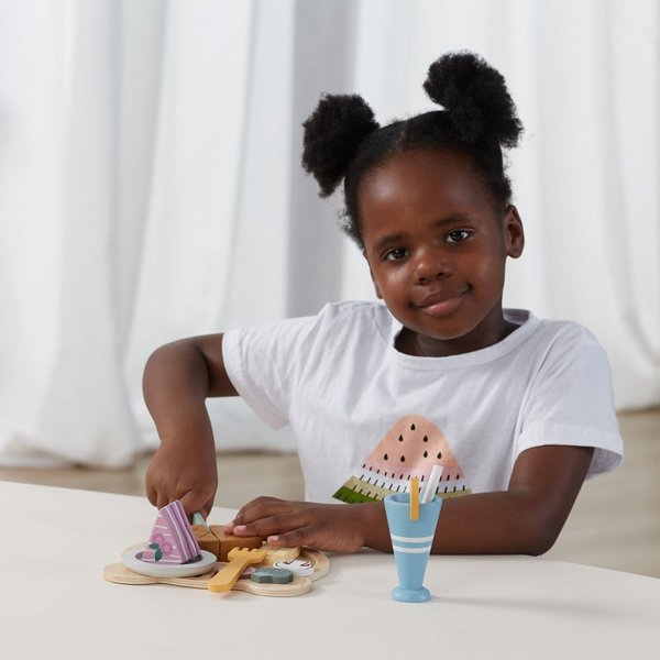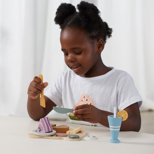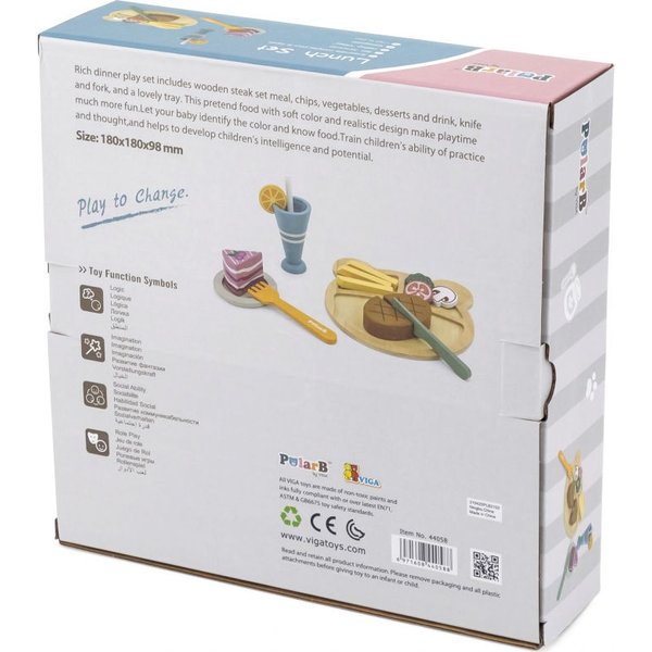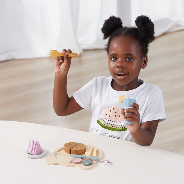 Teraz Twoje dziecko może dowolnie długo bawić się w krojenie drewnianego jedzenia, naśladując rodziców w codziennych czynnościach. Dzięki takiej zabawie maluch może ćwiczyć zdolności manualne, kreatywność oraz koordynację. To także doskonały wstęp do nauki gotowania. W zestawie znajdziesz takie elementy jak nożyk, widelec, talerzyki oraz atrapy jedzenia (stek, warzywa, picie ze słomką, ciastko, frytki). Wszystko zostało wyprodukowane z najwyższej jakości drewna pomalowanego nietoksycznymi farbami, w pełni bezpiecznymi dla maluchów.