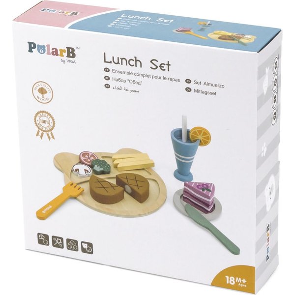 Drewniany zestaw obiadowy do krojenia PolarB marki Viga zachwyci każdego malucha lubiącego zabawę w dom.