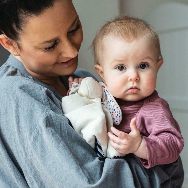 Miś przytulanka Dou-Dou od Wishbear to kolejny z ich produktów, który z pewnością pokochają noworodki. Otuli maluszka, stwarzając jednocześnie przytulne warunki do snu. Wykonany został z materiałów najwyższej jakości i nie podrażni delikatnej skóry maluszka. Wewnętrzna strona kocyka posiada czarno-białe pasy, które pozwolą stymulować wzrok. Wyposażony w specjalne supełki do których można dołączyć smoczek lub gryzak. Idealnie sprawdzi się w domu jak i podczas podróży. Miś może przesiąknąć zapachem rodzica sprawiając, że dziecko zaśnie czując się bezpiecznie. Można ją również bez problemu wyprać w pralce.
