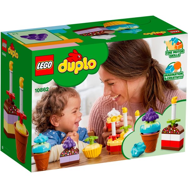 Z zestawem Moje pierwsze przyjęcie Duplo maluch może budować ciastka oraz duży tort, na którym może postawić świeczki i inne dekoracje, a następnie podzielić go na 4 części i bawić się w przyjęcie urodzinowe.