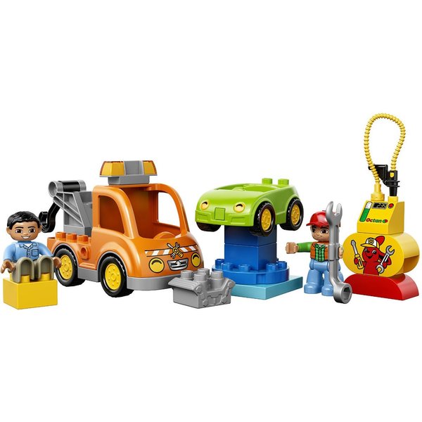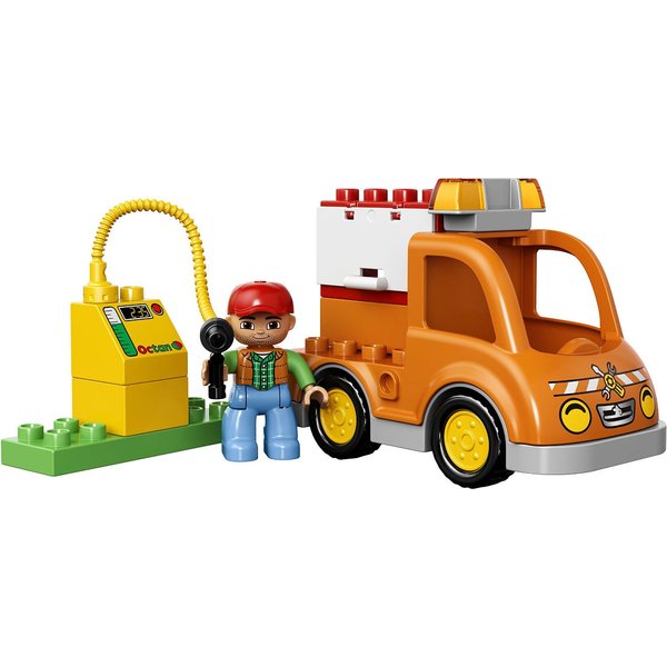 Jednemu z mieszkańców popsuł się samochód na środku ulicy i potrzebuje pomocy mechanika! Wsiądź do wozu pomocy drogowej i ruszaj na miejsce zdarzenia. Odholuj zepsute autko do warsztatu, a później użyj odpowiednich narzędzi by je naprawić. Gdy już wszystko sprawnie działa zatankuj bak samochodu do pełna i gotowe. Mały miłośnik klocków będzie zachwycony odgrywaniem wymyślonych historii z pojazdami w roli głównej!