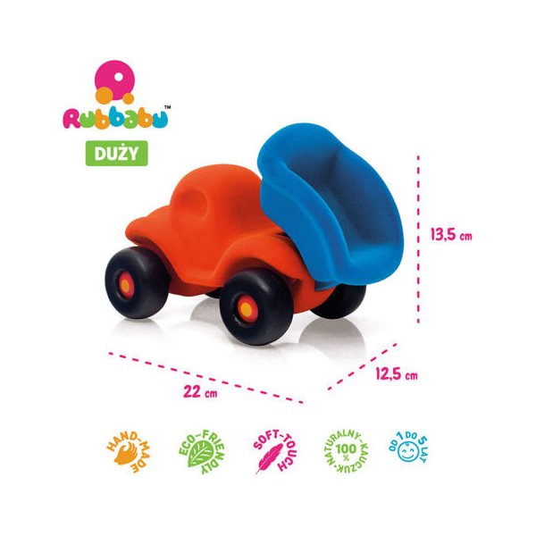 Uroczy pojazd od Rubbabu jest zdecydowanie jedyny w swoim rodzaju! Tej wyjątkowości dodaje mu fakt, że jest niezwykle miękki i przyjemny w dotyku. Jest dzięki temu bardzo lekki, a dzięki małym wymiarom maluch z łatwością chwyci go do rączek. Jego budowa sprawia, że można go bezpiecznie rzucać i ściskać. Posiada piękne, jaskrawe barwy obok, których nie da się przejść obojętnie! Wykonany został z naturalnego kauczuku, który jest przyjazny dla środowiska.