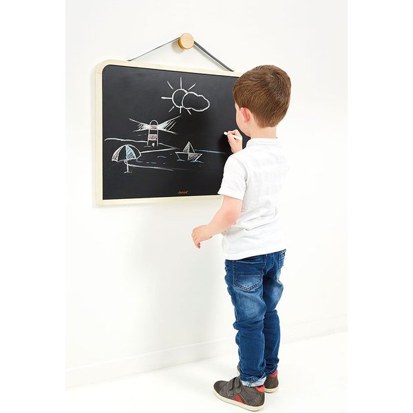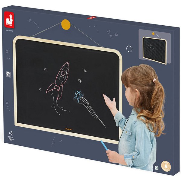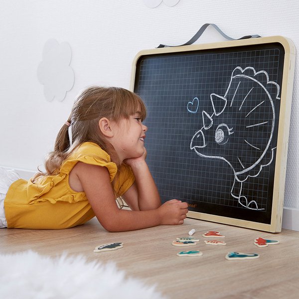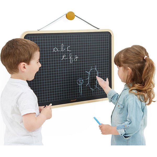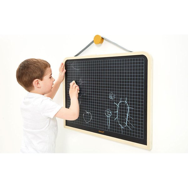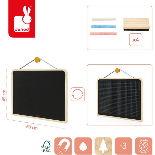 Drewniana dwustronna tablica ścienna z akcesoriami 3+ Janod to idealny prezent dla małego artysty i ucznia. Z jednej strony czarna powierzchnia do rysowania, a z drugiej strony czarna kratka do nauki pisania, liczenia i geometrii. Obie powierzchnie są magnetyczne, a w zestawie znajdują się kredy i gąbka do zmazywania. Tablica ma grubą drewnianą ramę i solidny pas do zawieszenia na ścianie. Zabawka rozwija wyobraźnię, zdolności manualne i artystyczne dziecka oraz pomaga w nauce pisania i liczenia. Zabawka edukacyjna marki Janod to wysoka jakość materiałów i precyzyjne wykonanie. Wyróżnia się niebanalnymi rozwiązaniami, a dzięki przypisaniu do odpowiedniej kategorii wiekowej, służy ćwiczeniu adekwatnych na danym etapie umiejętności.