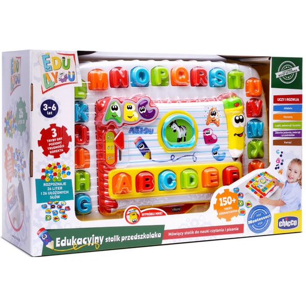 Pierwszy, edukacyjny stolik przedszkolaka od Chicco, który doskonale sprawdzi się na początku drogi z nauką czytania i pisania. Jest to jedna z tych zabawek, która zainspirowana została metodą Montessori stawia na samodzielność i naukę we własnym tempie. Maluch będzie mógł sam wprowadzać poprawki, a co za tym idzie - uczyć się na błędach. Dziecko będzie mogło uczyć się rozpoznawać literki poprzez układanie pierwszych słów, a gdy już nabierze te umiejętności, z powodzeniem będzie mogło zacząć przepisywać je na kartkę papieru.