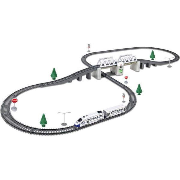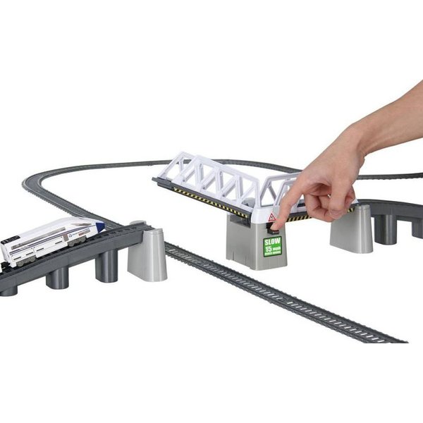 Długa na 366 cm trasa kolejki ma kształt dużej ósemki. Twoja pociecha na pewno z łatwością poradzi sobie z jej zbudowaniem. Lokomotywa ciągnąca wagonik pasażerski w mig pokona całą trasę, oświetlając sobie drogę czerwonym światełkiem. Po drodze napotka most zwodzony, który ma opcję podnoszenia i opuszczania, aby zabawa była jeszcze ciekawsza.