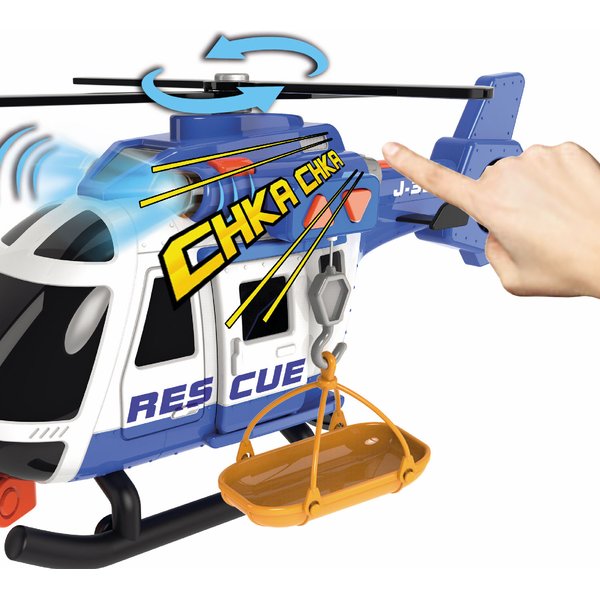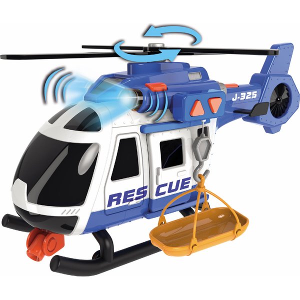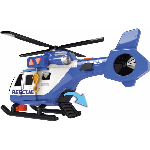 Każdy mały ratownik marzy o dużym helikopterze z elektrycznym hakiem...a taki właśnie jest ten model! Zabawka ma około 38 cm długości i doskonale odzwierciedla prawdziwy helikopter ratunkowy. Posiada otwierane drzwi kadłuba, tylną klapę, opuszczany hak z noszami, obrotowe śmigła, a do tego wydaje sygnał świetlny i dźwiękowy - prawdziwa frajda dla malucha!Dodatkowo zabawka została wyposażona nosze.