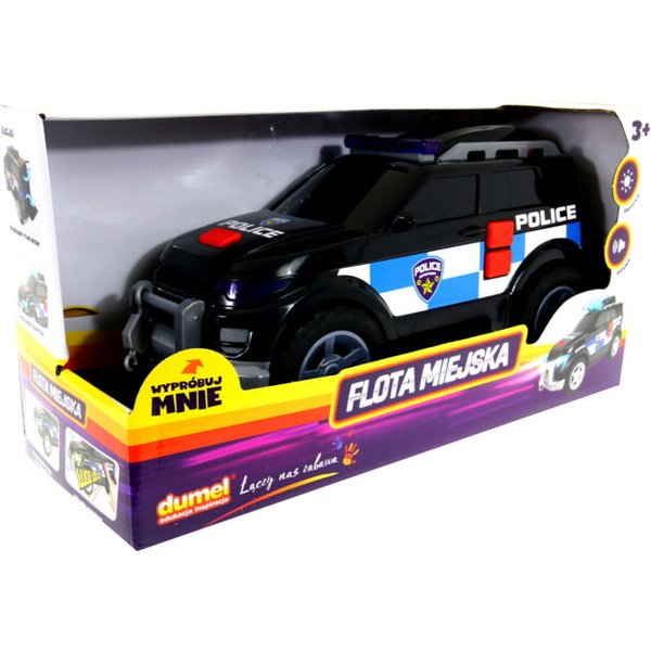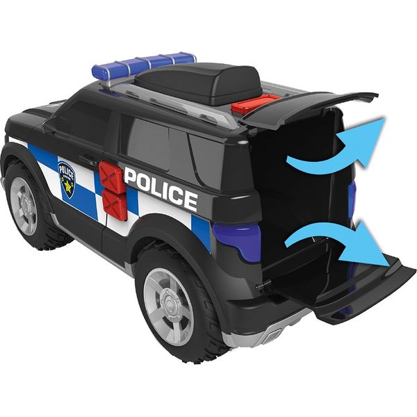 Każdy mały policjant marzy o własnym wozie policyjnym z sygnałem dźwiękowym...a taki właśnie jest ten model! Pojazd doskonale odzwierciedla prawdziwy terenowy wóz policyjny, ma około 34 cm długości i utrzymany jest w czarnej kolorystyce. Wóz wydaje sygnał świetlny i dźwiękowy - prawdziwa frajda dla malucha!Ponadto został wyposażony w wysuwany hak holowniczy oraz otwierane tylne drzwi, co daje to jeszcze więcej możliwości podczas akcji interwencyjnych.