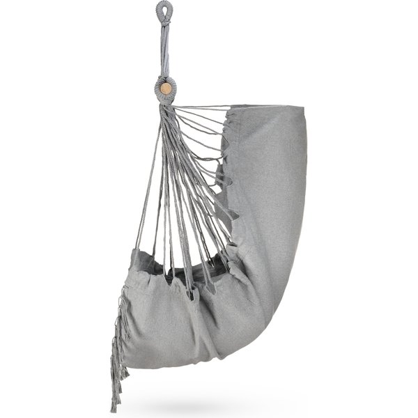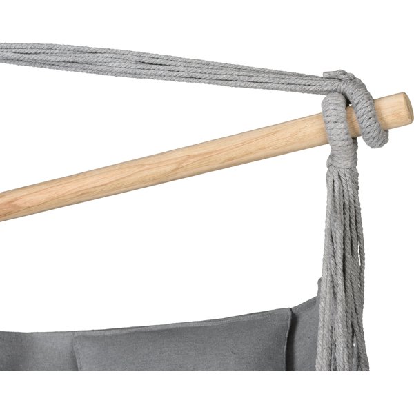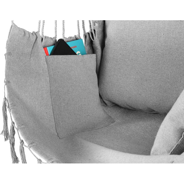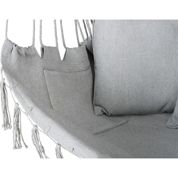 Hamak wykonano z wytrzymałego materiału będącego połączeniem bawełny i poliestru. Tkanina ta cechuje się podwyższoną odpornością na przetarcia i uszkodzenia mechaniczne. Również dzięki niej maksymalne obciążenie hamaka wynosi 140kg. Prosty montaż i kompaktowe wymiary sprawiają, że znajdziesz na niego miejsce nawet na niewielkim balkonie. Nic nie stoi na przeszkodzie, by fotel ten zamontować również w salonie czy sypialni. Przewiewna konstrukcja zapewnia komfort wypoczynku w upalne dni.