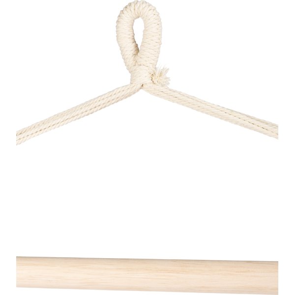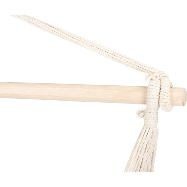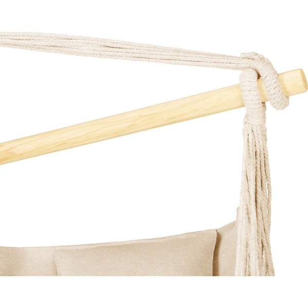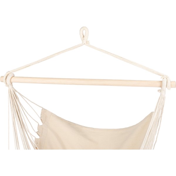 Hamak wykonano z wytrzymałego materiału będącego połączeniem bawełny i poliestru. Tkanina ta cechuje się podwyższoną odpornością na przetarcia i uszkodzenia mechaniczne. Również dzięki niej maksymalne obciążenie hamaka wynosi 140kg. Prosty montaż i kompaktowe wymiary sprawiają, że znajdziesz na niego miejsce nawet na niewielkim balkonie. Nic nie stoi na przeszkodzie, by fotel ten zamontować również w salonie czy sypialni. Przewiewna konstrukcja zapewnia komfort wypoczynku w upalne dni.