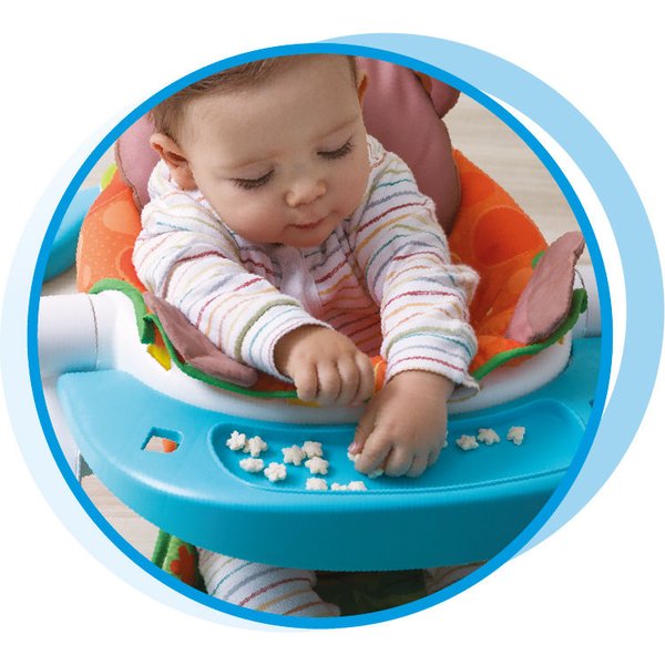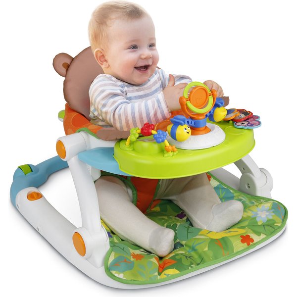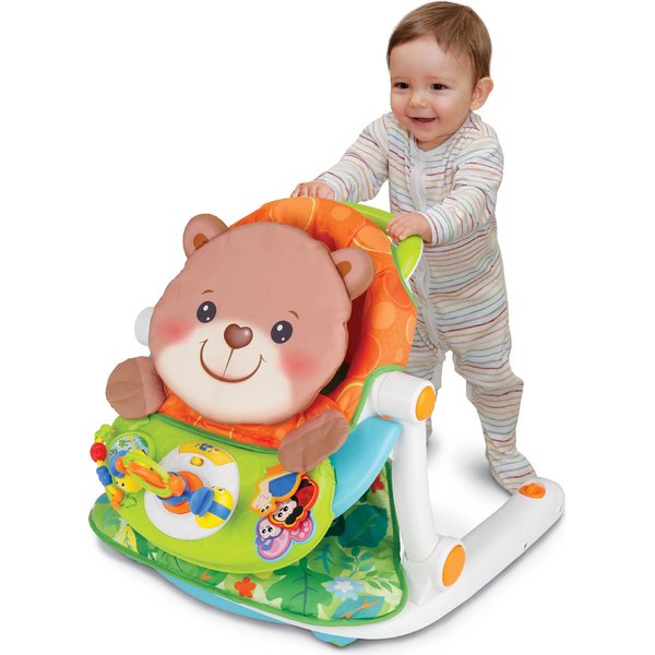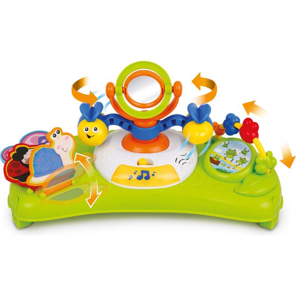 W początkowym etapie, gdy maluszek nie potrafi jeszcze stawiać swoich pierwszych kroków zabawka posłuży jako wygodny fotelik do siedzenia, karmienia czy wspaniałej zabawy. Na maluszka czeka wiele atrakcji! Stoliczek do zabawa posiada przesuwne korale, obrotowe,bezpieczne lusterko, wirujące pszczoły, zwierzątka do przewracania ponadto wydaje efekty świetlne i dźwiękowe.