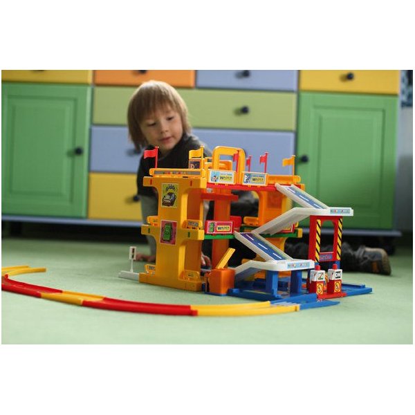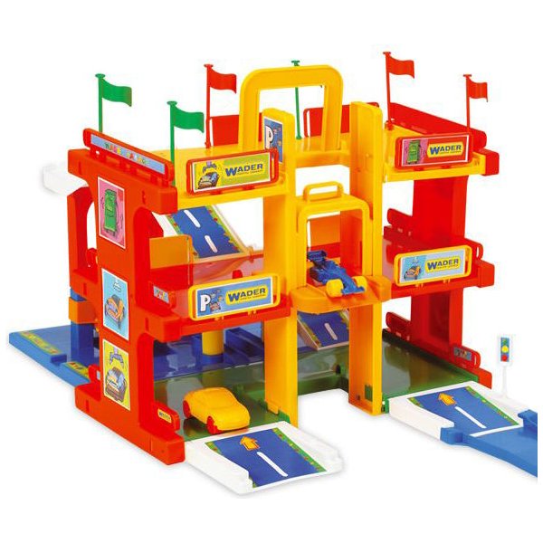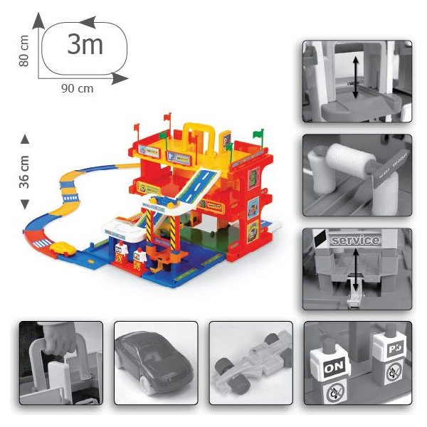 Wader Garaż z drogą - w skład zestawu wchodzi 3-poziomowy garaż z windą oraz myjnią, 2 autka (mogą się różnić od tych na zdjęciu), stacja benzynowa, stanowisko diagnostyczne oraz 3m drogi. Dodatkowo do zestawu dołączono barwną wycinankę, przy pomocy której dziecko może z łatwością stworzyć ciekawe otoczenie.