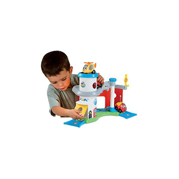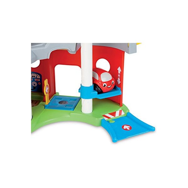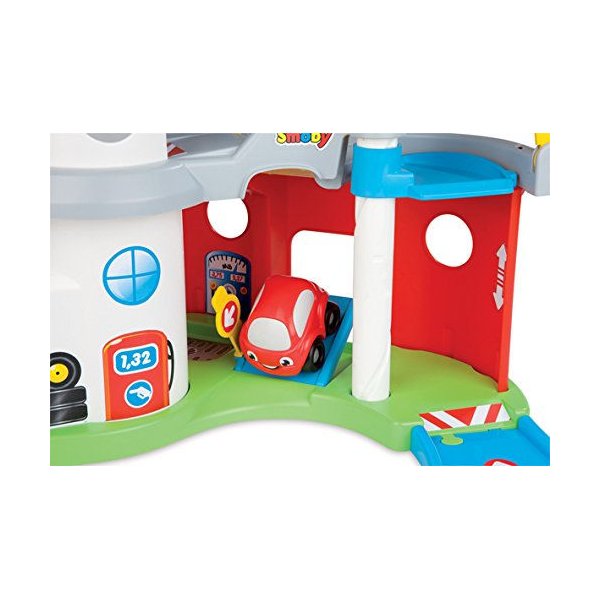 Posiada wszystko to, co powinien mieć idealny garaż dla autek, a więc ruchomą windę, punkt serwisowy, stację benzynową, a także liczne zakręty zapewniające jeszcze więcej zabawy! Dwupoziomowy garaż wyposażony jest w jeden samochodzik.