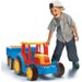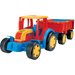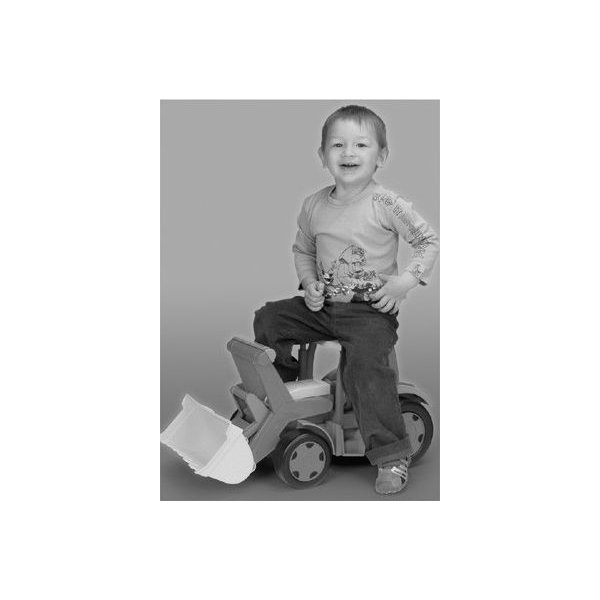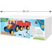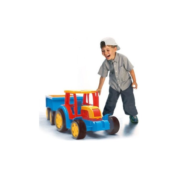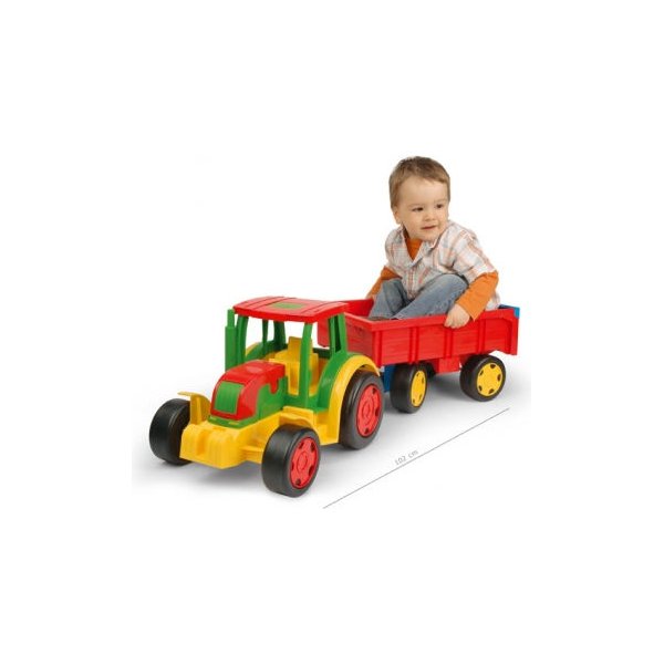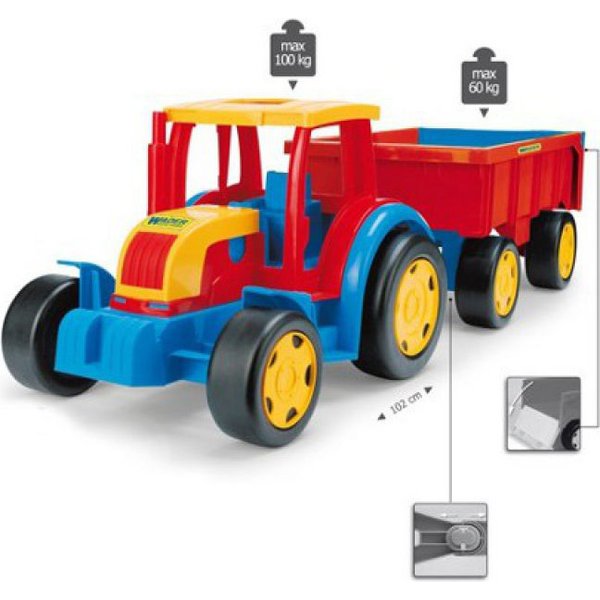Masywny i bezpieczny traktor z przyczepą, na którą dziecko ładuje różne przedmioty (nośność do 60 kg). Spychacz o nośności 100 kg może służyć jako odpychaniec. Przyczepka po doczepieniu dyszla z zestawu zmienia się w wózek do ciągnięcia.