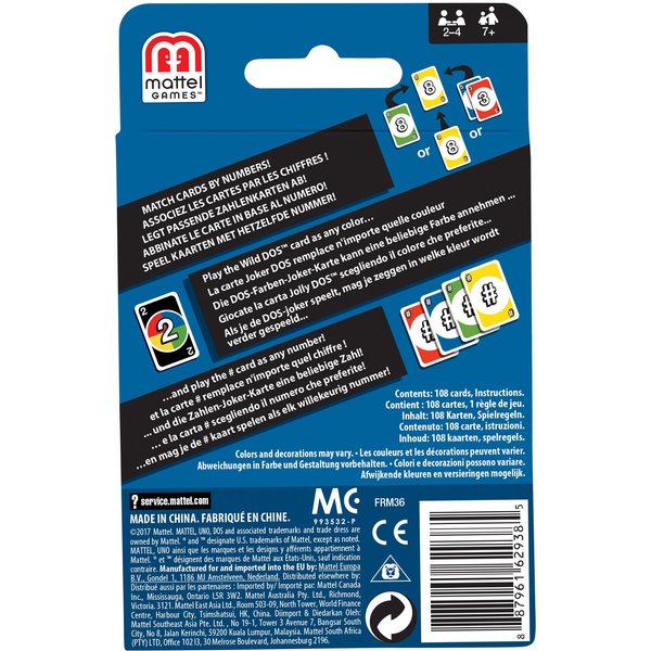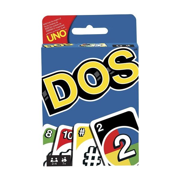 Gra karciana, składająca się ze 108 kart w różnych kolorach oraz karty specjalne. Celem gry jest jak najszybsze pozbycie się kart w każdej rundzie i zdobycie punktów za karty, które zostały w rękach innych graczy. Zwycięża gracz, który jako pierwszy zdobędzie określoną ilość osób. Nie zapomnijcie krzyknąć "DOS!", gdy w ręku będziecie mieć dwie karty! Gra wzorowana jest na starszej wersji "UNO". Zestaw zapakowany jest w kolorową puszkę, w której znajduje się 108 kart, instrukcja, tabliczka do zapisywania punktów i ołówek.