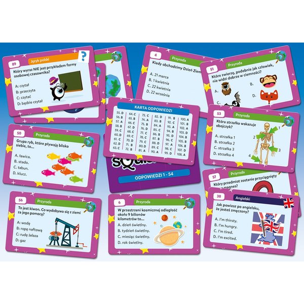 Gra Squla teraz również w wersji karcianej! Stan do rozgrywki w niesamowitym quzie, odpowiadaj błyskawicznie by wyprzedzić przeciwnika. Każdy z graczy będzie musiał zmierzyć się z podchwytliwymi pytaniami(ponad 100) związanymi ze szkolnymi przedmiotami. Gdy pojawi się karta na stole odpowiedź jak najszybciej, gracz, który to zrobi otrzymuje punkty. Wygrywa ten kto zgromadzi jak największa ilość punktów.
