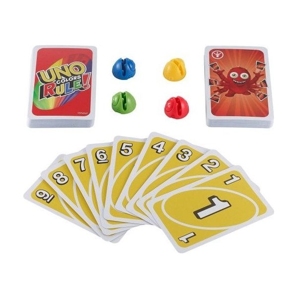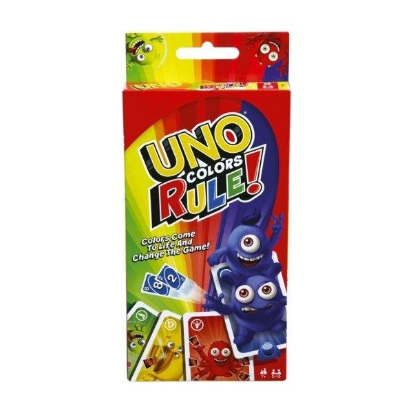 Gra Uno "Kolory Rządzą" to nowsza edycja znanej gry towarzyskiej, która jest urozmaicona o kolory i śmieszne postacie na kartach. Kiedy gracz zdobędzie jedną z czterech kolorowych kart mocy, zyska możliwości, które wzmocnią jego pozycje. Zestaw zawiera 112 kart w różnych kolorach, karty specjalne i 4 uchwyty na karty. Celem gry jest jak najszybsze pozbycie się kart w każdej rundzie i zdobycie punktów za karty, które zostały w rękach innych graczy. Zwycięża gracz, który jako pierwszy zdobędzie 500 punktów.