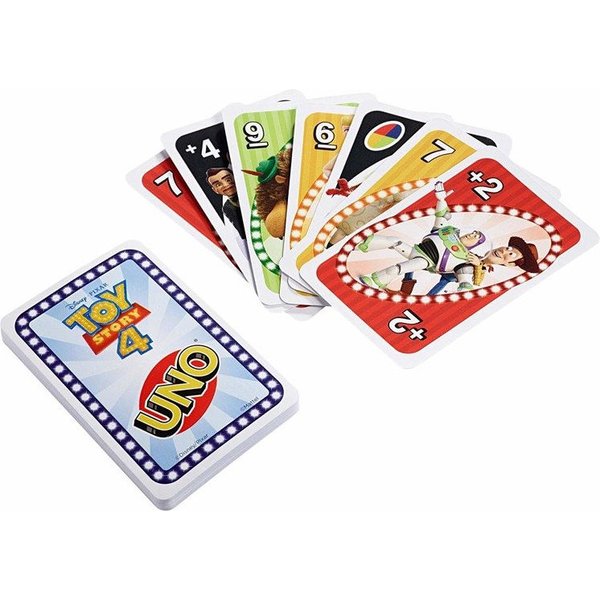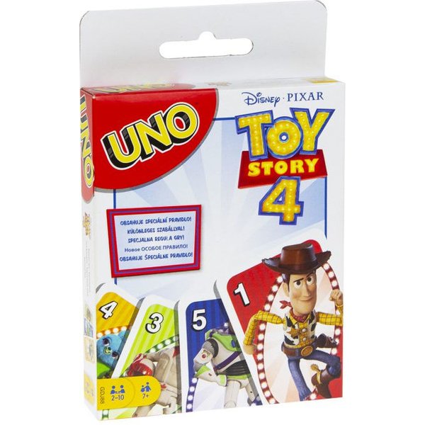 Znana gra karciana składa się ze 112 kart z ilustracjami bohaterów Toy Story 4. Celem gry jest jak najszybsze pozbycie się kart w każdej rundzie i zdobycie punktów za karty, które zostały w rękach innych graczy. Nie zapomnijcie krzyknąć "UNO!", gdy w ręku będziecie mieć tylko jedną kartę! Jeśli zapomni, a inni przeciwnicy to zauważą, bierze kolejne karty.