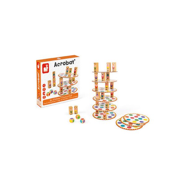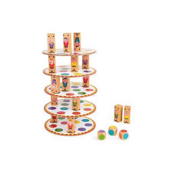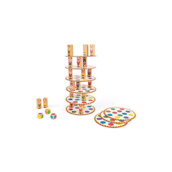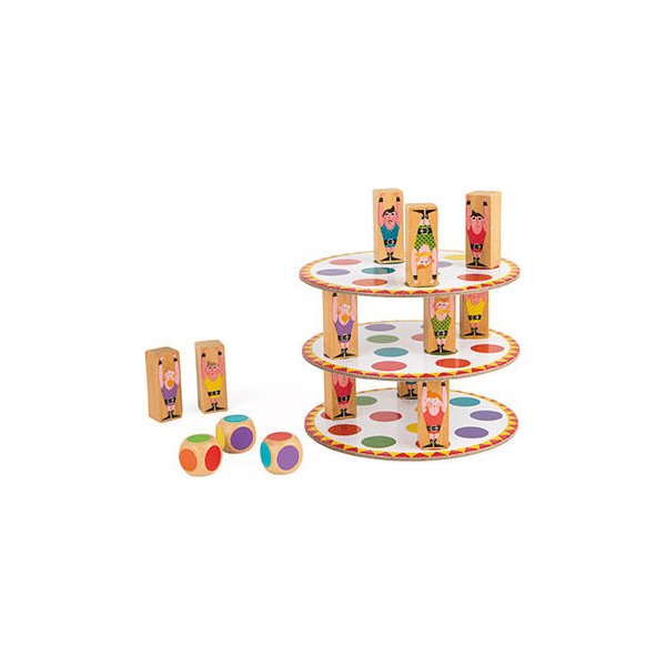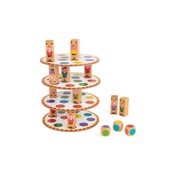 Gra dla 2-8 graczy, w której zmierzymy się z akrobatyczną wieżą! Każdy z graczy ma za zadanie ustawienie 3 akrobatów na planszy w kółeczkach o kolorach wylosowanych na kostce. Twórz niepowtarzalną budowlę jednak gracz, który doprowadzi do upadku przegrywa.