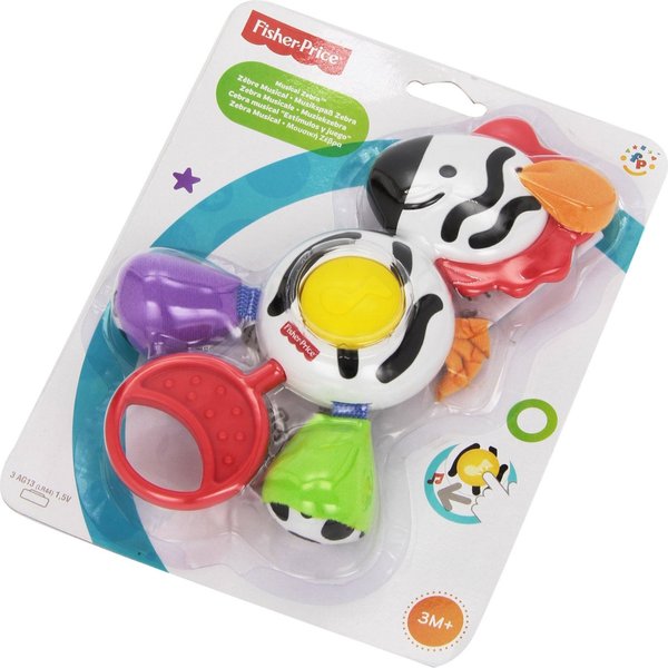Zróżnicowane faktury zapewniają dziecku wrażenia dotykowe. Zebra ma miękkie nóżki idealne do tarmoszenia i materiałowe uszka do gryzienia . Gdy maluszek wciśnie przycisk na środku zabawki usłyszy wesołą melodię.