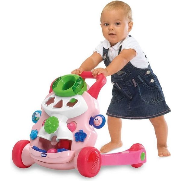 Zabawka spełnia podwójną funkcję - po pierwsze, ułatwia dziecku stawianie pierwszych kroków, a szeroki rozstaw kół zapewnia stabilność i bezpieczeństwo podczas nauki. Po drugie, pchacz może być wypełnionym atrakcjami centrum zabaw, które będzie rozwijać zdolności manualne dziecka.